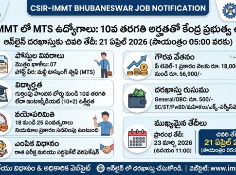 కేంద్ర శాస్త్ర మరియు సాంకేతిక మంత్రిత్వ శాఖ పరిధిలోని భువనేశ్వర్కు చెందిన CSIR-IMMT, ఖాళీగా ఉన్న మల్టీ టాస్కింగ్ స్టాఫ్ (MTS) పోస్టుల భర్తీకి నోటిఫికేషన్ విడుదల చేసింది. ఆంధ్రప్రదేశ్ మరియు తెలంగాణ రాష్ట్రాల అభ్యర్థులు కూడా ఈ ఉద్యోగాలకు దరఖాస్తు చేసుకోవచ్చు.