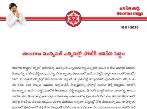 (MS8NEWS జనవరి 10)హైదరాబాద్: తెలంగాణలో రాజకీయంగా బలపడటంపై జనసేన పార్టీ తన వ్యూహాన్ని వేగవంతం చేసింది. రాష్ట్రంలో జరగనున్న రాబోయే మున్సిపల్ ఎన్నికల్లో పోటీ చేయాలని ఆ పార్టీ అధిష్టానం కీలక నిర్ణయం తీసుకుంది. కేవలం పోటీ చేయడమే కాకుండా, పార్టీని క్షేత్రస్థాయిలో సంస్థాగతంగా బలోపేతం చేయడమే లక్ష్యంగా అడుగులు వేస్తోంది.